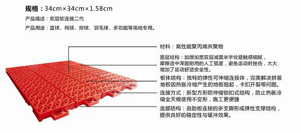 獨(dú)特研發(fā)設(shè)計(jì)的16小塊軟連接結(jié)構(gòu),使地板與地面輕松實(shí)現(xiàn)無縫貼合,大大降低地板對地面基礎(chǔ)的要求。同時,地板無懸空,還保證了籃球、網(wǎng)球等各類球體降落時的良好回彈性,解決場地球體變向問題